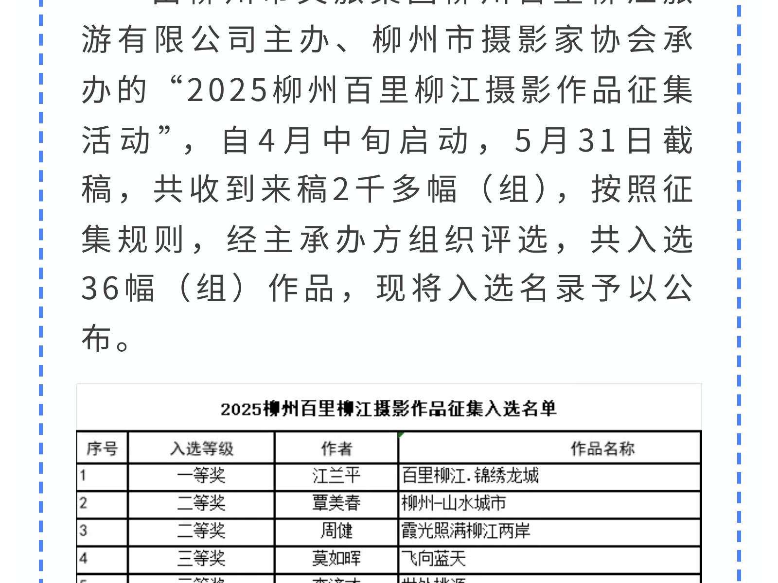 定格最美柳江!首屆“百里柳江”攝影大賽獲獎作品出爐! 發(fā)布時間:2025年07月16日 10時來源:本站原創(chuàng)瀏覽:69 人次