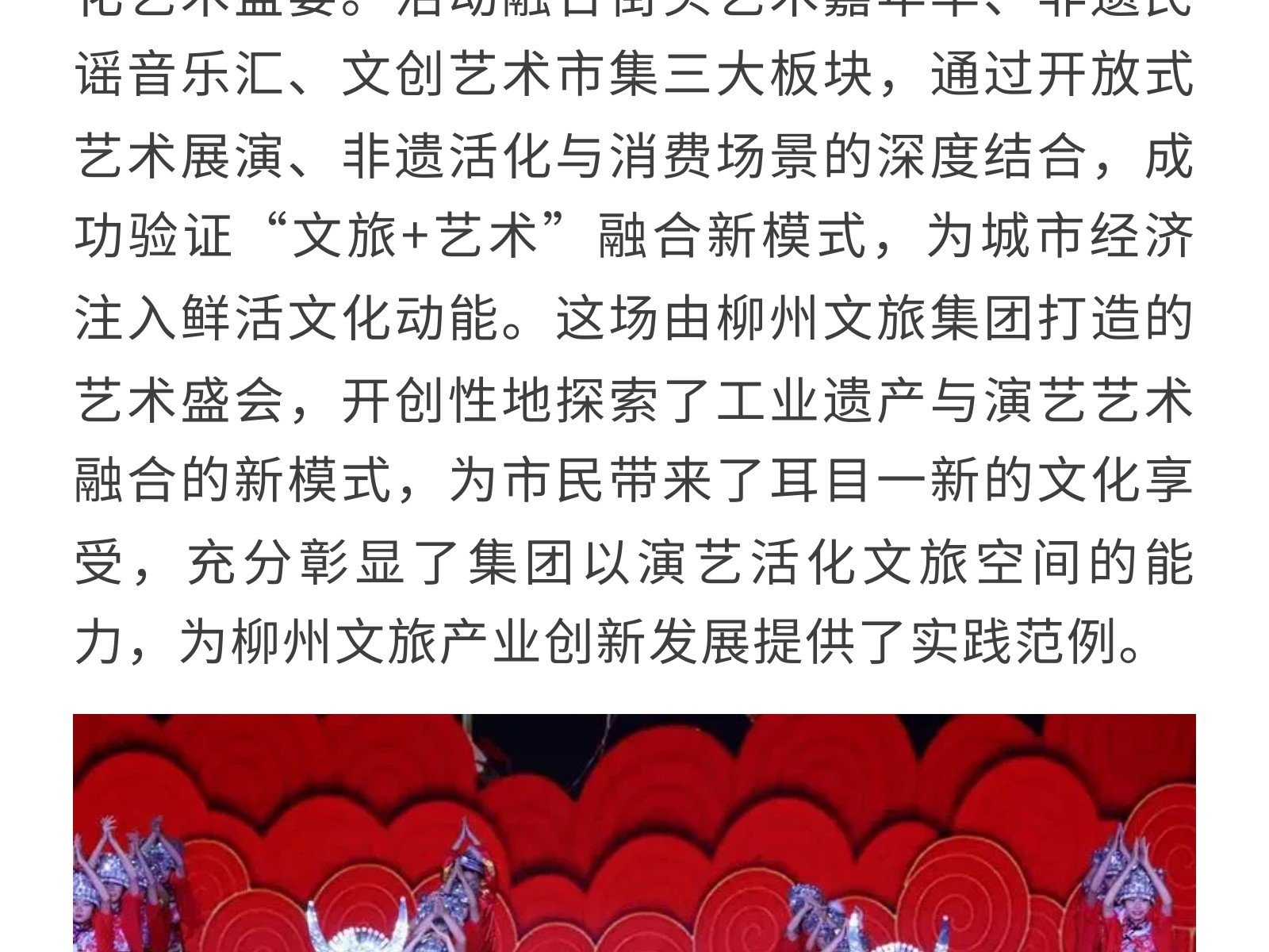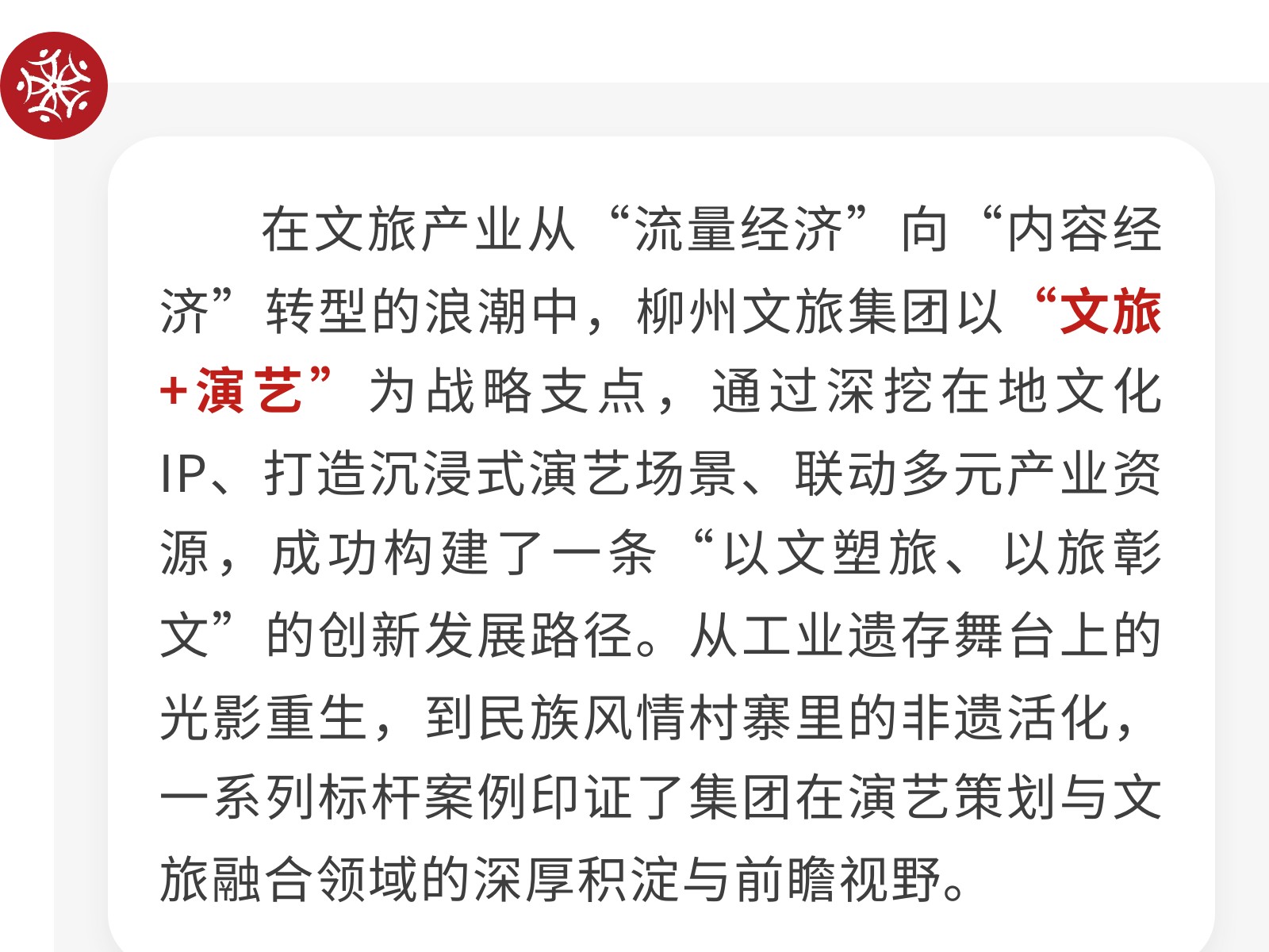 文旅融合新篇章:柳州文旅集團(tuán)以演藝為媒,激活城市文化基因 發(fā)布時(shí)間:2025年09月26日 10時(shí)來(lái)源:本站原創(chuàng)瀏覽:16 人次