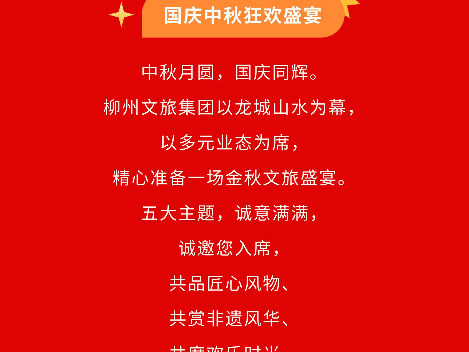 【雙節(jié)同慶,盛情以待】柳州文旅集團(tuán)邀您共赴一場金秋文旅盛宴 發(fā)布時間:2025年09月30日 16時來源:本站原創(chuàng)瀏覽:16 人次